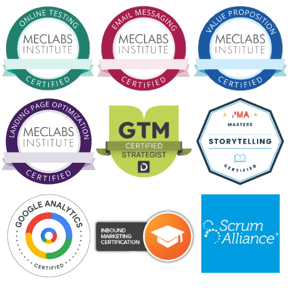 I hold certifications in various marketing areas, encompassing content marketing, email messaging, value proposition development, landing page optimization, SEO, storytelling, PPC, conversion rate optimization, social media, social selling, and beyond!